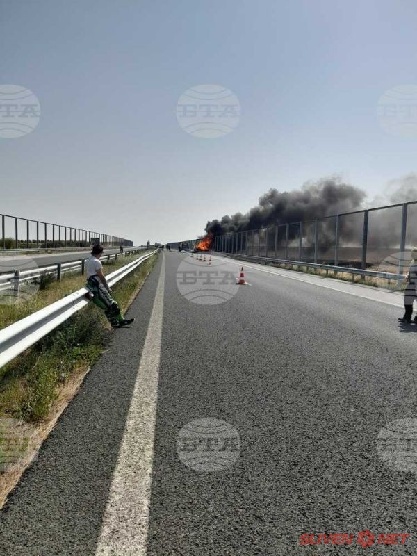 Както БТА съобщи, произшествието е станало по време на движение в района на 270-и километър от автомагистралата. Причината е спукана по време на движение гума, от чието триене се възпламенява ремаркето. Освен товарът, са унищожени ремаркето и регистрационните табели.