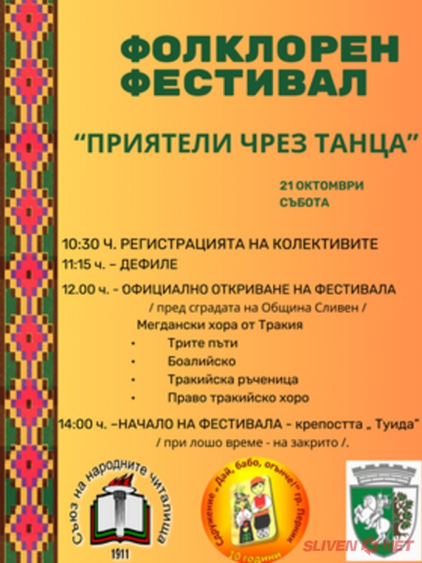 Фолклорен фестивал „Приятели чрез танца“ за любителски клубове, младежки и детски танцови ансамбли ще събере близо 400 любители на българския танцов фолклор на 21 октомври 2023 г. в Сливен. Това съобщи за БТА Таня Георгиева от Танцова къща "Приятели чрез танца".