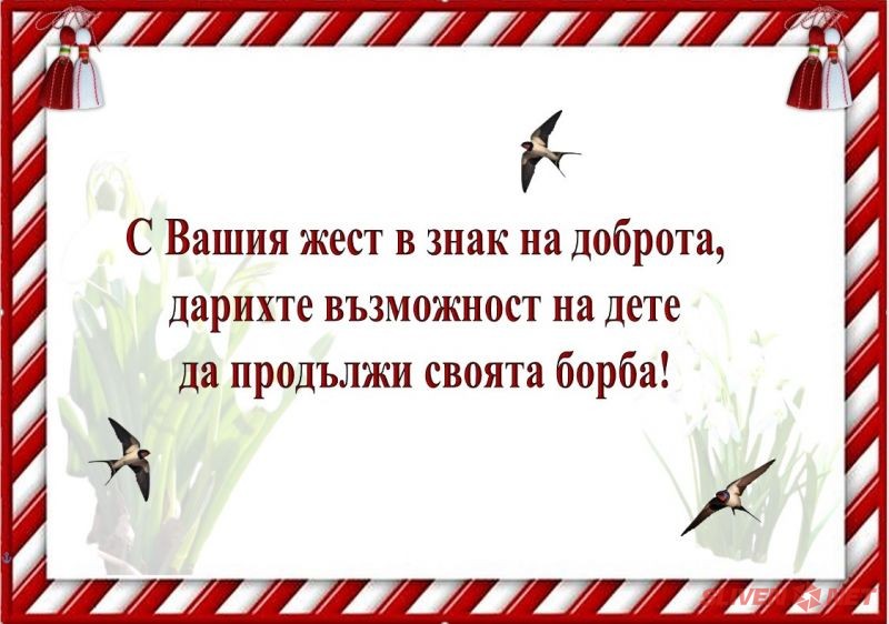 По първи март Нова Загора се обедини около поредната благородна кауза. Началото беше поставено от Община Нова Загора с организирането на работилничка за мартеници на 26 февруари, в която се включиха децата и колективите на детските градини „Слънчице“, „Тракийче“, „Надежда“, „Бодра смяна“ и „Детски свят“ и Център за обществена подкрепа в гр. Нова Загора. Богатата колекция от изработени красиви изделия беше подредена на изложба-базар пред Спортна зала „Младост“ и предизвика интереса на новозагорци в дните преди първи март. За атрактивното изживяване допринесоха и самодейците от НЧ „Христо Ботев – 1920“ с. Млекарево – Баба Марта и нейният усмихнат помощник от Туристически център Нова Загора. Съпричастни към идеята се оказаха много граждани. Благотворителната кутия беше поставена и при честването на Националния празник на Република България на 3 март. Общинското ръководство изказва сърдечна благодарност на всички благотворители. В резултат на общата щедра спомоществователност бяха събрани 5035 лв. за лечението на Боян Калайджиев от с. Млекарево. С мартеници българите се закичват за здраве, те сплотиха жителите на нашата община и за да подкрепят оздравяването и да дадат надежда на едно единадесетгодишно дете.