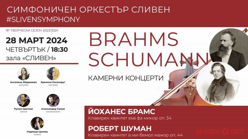 Клавирен квинтет оп. 34 от Йоханес Брамс и Клавирен квинтет оп. 44 от Роберт Шуман ще прозвучат в зала “Сливен” на 28 март.