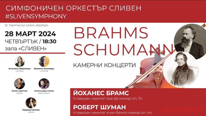 Две изключителни произведения - Клавирен квинтет оп.34 от Йоханес Брамс и Клавирен квинтет оп.44 от Роберт Шуман, ще прозвучат в зала “Сливен” в Четвъртък 28 Март 2024 от 18.30 часа. Изпълнението им ще бъде в ръцете на петима фантастични български музиканти - Ангелина Абаджиева /цигулка/, Кремена Оксенкруг /цигулка/, Румен Цветков /виола/, Александър Сомов /виолончело/ и Надежда Цанова /пиано/.