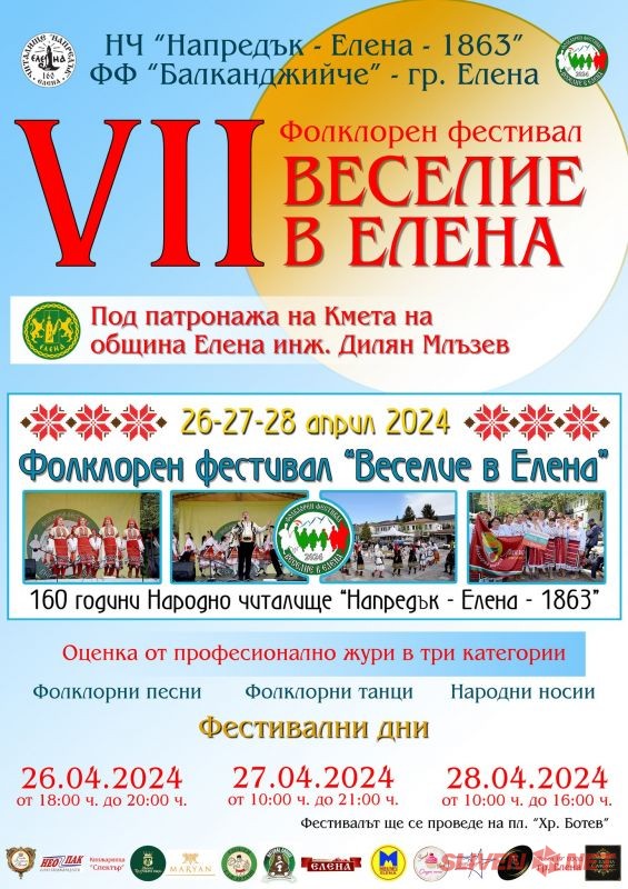 На 26, 27 и 28 април 2024 година ще се проведе VII-ми ФОЛКЛОРЕН ФЕСТИВАЛ - НАДИГРАВАНЕ И НАДПЯВАНЕ "ВЕСЕЛИЕ В ЕЛЕНА", провеждан под патронажа на кмета на Община Елена!