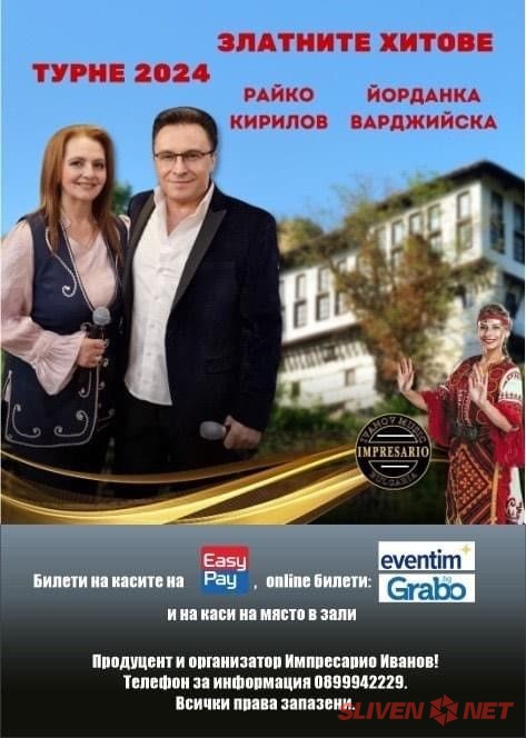 Райко Кирилов и Йорданка Варджийска - едни от най-обичаните изпълнители, които всеки път са очаквани с нетърпение от нейно величество - публиката! Познати и разпознаваеми с хитовите си песни и този път ще докоснат сърцата на Вас - техните почитатели! Ще Ви подарят незабравими емоции, и зарадват с обичани и популярни хитове, ще оставят незабравими спомени с тазгодишното си турне "Златните хитове" на Райко Кирилов и Йорданка Варджийска - 2024 година. Заповядайте и нека заедно се насладим на стойностната и хубава песен с - Райко Кирилов и Йорданка Варджийска!