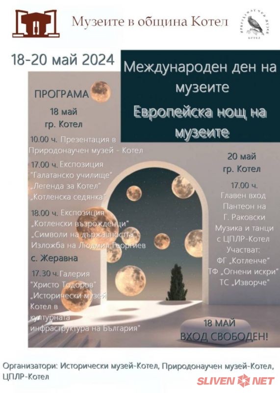 Музейните експозиции в Котел и Жеравна в очакване на 18 май – Международен ден на музеите и Европейска нощ на музеите. В тази връзка Природонаучния и Историческия музей в Котел и музейните експозиции в Жеравна предлагат на своите посетители празнични програми, в които има презентации, изложби, концерти и др.