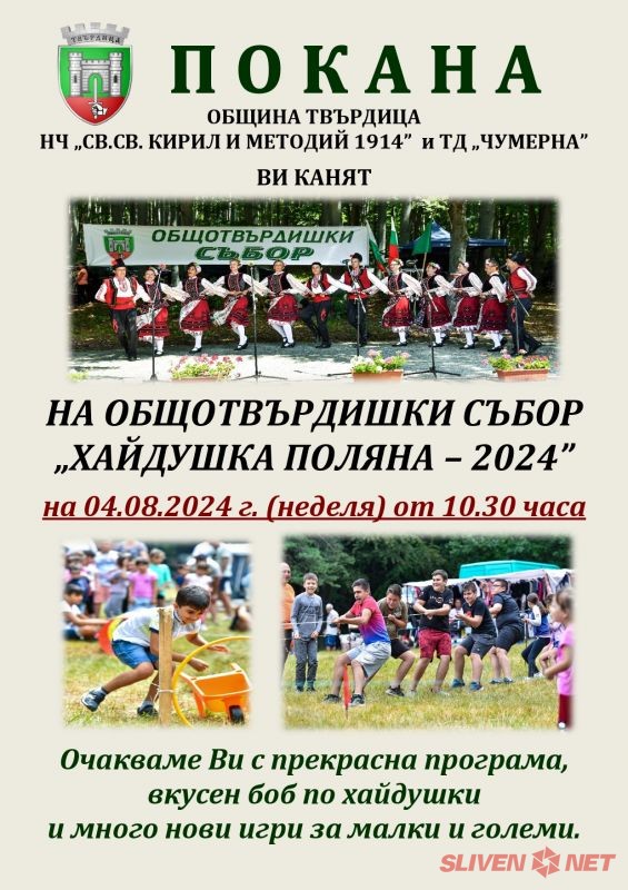 ОБЩОТВЪРДИШКИ СЪБОР "ХАЙДУШКА ПОЛЯНА - 2024" на 4 август (неделя) с прекрасна програма, вкусен боб по хайдушки и много нови игри за малки и големи.