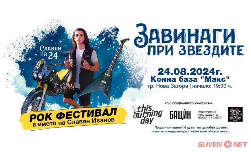 Само дни след рождения ден на Славян Иванов, който тази година трябваше да навърши 24г., на 24 август от 19 часа в Конна база „Макс“, гр. Нова Загора ще се състои рок фестивалът в негова памет „Завинаги при звездите“. Концертът се провежда за трети пореден път по инициатива на Иван Иванов - баща на новозагорския талант от клас „Китара“ към ОШИ „Илия Аврамов“ и е подпомогнат от Община Нова Загора. В него участие тази година ще вземат група „This Burning Day”, ученически рок групи и група „Бащин“, в състава на която влиза бащата на Славян със свои приятели – новозагорски музиканти.