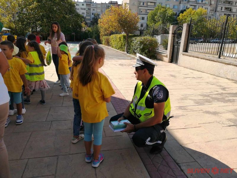 Децата от детска градина „Еделвайс” в град Сливен посрещна началника на сектор „Пътна полиция” главен инспектор Илиян Николов и инспектор Николай Атанасов в час по пътна безопасност. Полицейските служител проведоха урок по безопасно поведение на пътя като повече от час ангажираха вниманието на децата с правилата за движение, безопасно пътуване като пътници в автомобилите и безопасно управление на велосипеди. Запознаха се на практика с основните знаци и светофарната уредба. Под строй, заедно със своите учители, те показаха как се пресича правилно на пешеходните пътеки на кръстовището с булевард „Стефан Стамболов” и „Георги Данчев”. Детската градина се намира в най-големия квартал на град Сливен „Дружба” и те всеки ден се движат по тези булеварди и се налага да пресичат. Децата показаха сериозни познания по темата за безопасността, похвалиха своите родители, че редовни си слагат предпазните колани и използват детски столчета в личните автомобили. Знаят от коя страна трябва да слизат от автомобила, за да е безопасно и познават голяма част от пътните знаци.