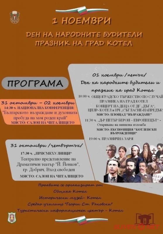 От днес започва програмата, посветена на Деня на народните будители и празника на град Котел. Програмата включва: национална ученическа конференция, винилна изложба, с акцент 200-годишнината от издаването на „Буквар с различни поучения“ по известен като „Рибния буквар“, театрална постановка и други културни изяви.