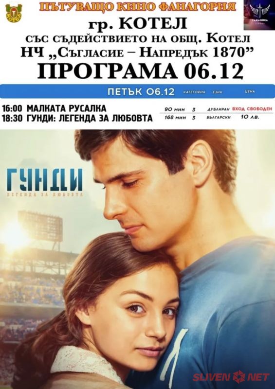 Кметът на Котел, г-н Коста Каранашев, кани всички жители и гости на общината на вълнуваща филмова вечер! На 6 декември, петък, в Котел ще бъде излъчен подобряващият рекорди за българското кино филм „Гунди – легенда за любовта“. Лентата разказва за незабравимата история на футболната легенда Георги Аспарухов – Гунди.