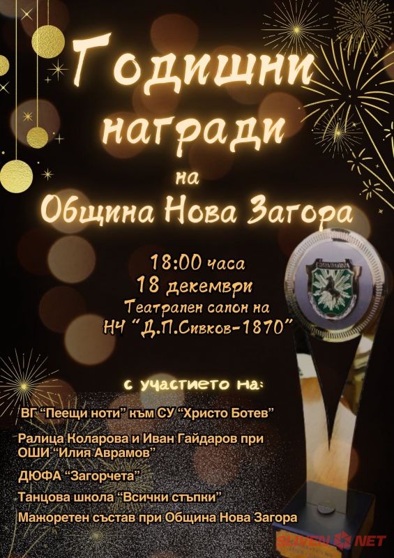 Община Нова Загора кани всички жители и гости на официалната церемония по връчването на годишните награди, която ще се състои на 18 декември от 18:00 часа в театралния салон на НЧ „Д. П. Сивков-1870“.