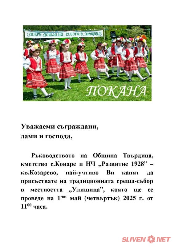 Община Твърдица, кметството на село Конаре и НЧ „Развитие 1928“ – кв. Козарево канят всички жители и гости на региона да се присъединят към традиционната среща-събор, която ще се проведе на 1 май 2025 г. (четвъртък) от 11:00 часа в живописната местност „Улишица“.