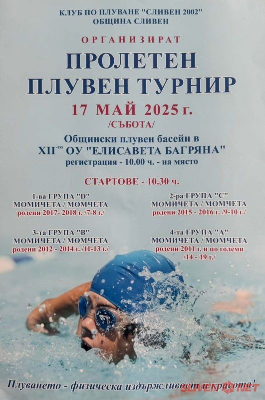 Тази събота, 17 май 2025 г., Сливен ще се превърне в арена на спортен дух и талант по време на пролетния плувен турнир, организиран от Клуб по плуване „Сливен 2002“ и Община Сливен.