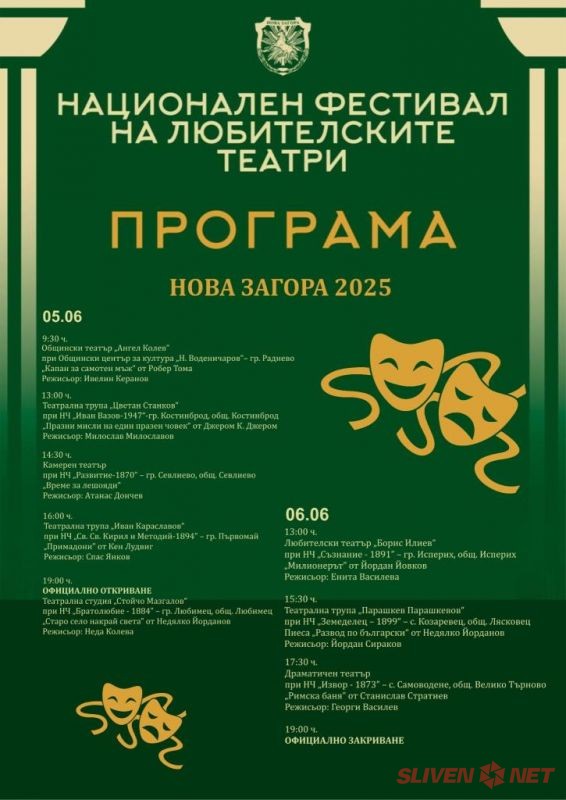 На 5 и 6 юни сцената на Народно читалище „Д. П. Сивков – 1870“ в Нова Загора отново ще се изпълни с театрална магия. Градът е домакин на Националния фестивал на любителските театри, който ще събере самодейни състави от цяла България, за да представят едни от най-обичаните български и световни пиеси.