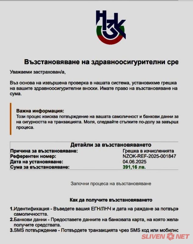 В ход е активна фишинг кампания от името на Националната здравноосигурителна каса. Атаката е насочена към здравноосигурени лица и се разпространява чрез електронните пощи. Съобщението отправя призив към потребителите да поискат възстановяване на надплатени суми от внесени здравноосигурителни вноски поради „грешка в изчисленията“ и подканва към попълване на банкови и лични данни. Документът е с типичната за случая при подобни атаки подвеждаща визия, съдържаща официалните отличителни знаци на институцията.