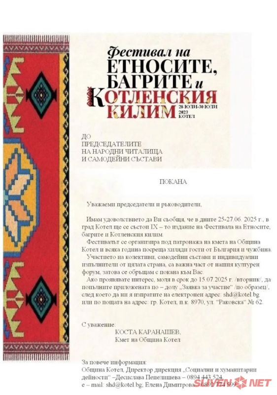 Община Котел официално отправя покана към председателите на народни читалища и ръководителите на самодейни състави от цялата страна за участие в деветото издание на Фестивала на етносите, багрите и Котленския килим. Събитието ще се проведе от 25 до 27 юли 2025 г. в град Котел под патронажа на кмета на общината г-н Коста Каранашев.