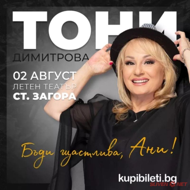 Община Твърдица отправя сърдечна покана към всички жители за едно незабравимо музикално преживяване! На 2 август 2025 г. (събота) от 21:00 часа, в Летния театър на гр. Стара Загора, ще се състои концерт на любимата българска изпълнителка Тони Димитрова, под надслов „Бъди щастлива, Ани!“. На сцената ще ѝ партнират и обичаните братя Аргирови.