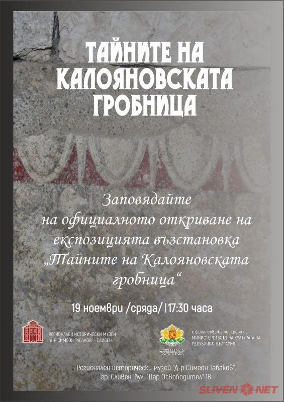 На 19 ноември (сряда) от 17:30 ч., в сградата на Регионален исторически музей „Д-р Симеон Табаков“ – Сливен, ще бъде открита експозицията-възстановка „Тайните на Калояновската гробница“.