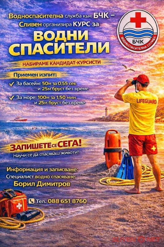БЧК – Сливен организира провеждането на курс за водни спасители на басейн и водни спасители на плаж от 09.03.2026г.