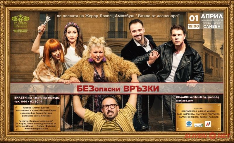 На 1 април от 19:00 часа на сцената на Драматичен театър „Стефан Киров“ – Сливен ще бъде представена комедията „БЕЗопасни ВРЪЗКИ“, създадена по пиесата на френския драматург Жерар Лозие „Амюзбуш/Вляво от асансьора“.